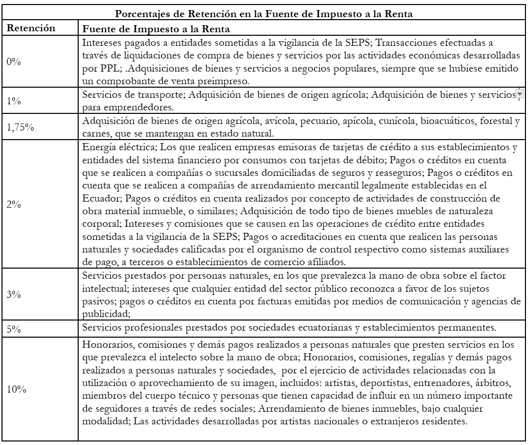 - Se establecen los siguientes porcentajes de retención, de acuerdo con la fuente del Impuesto a la Renta